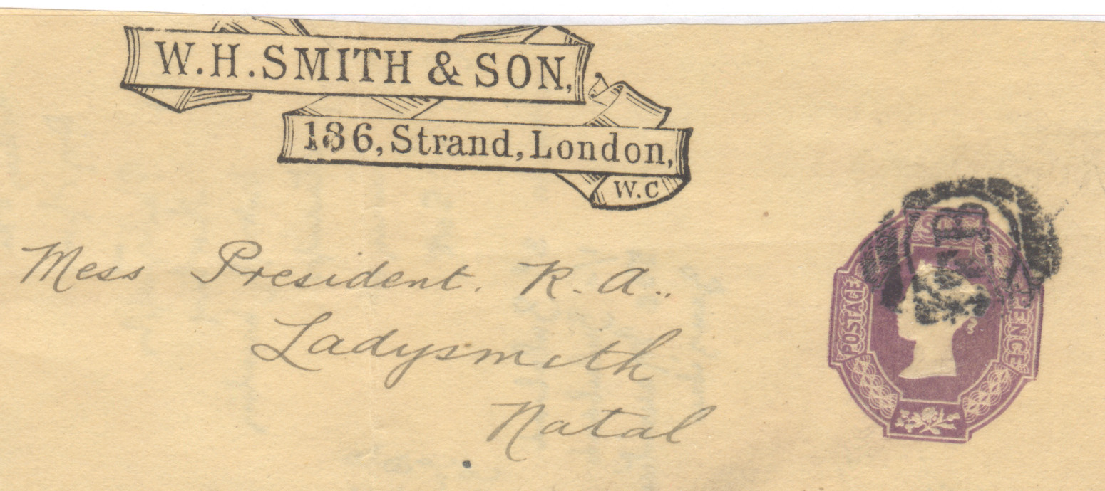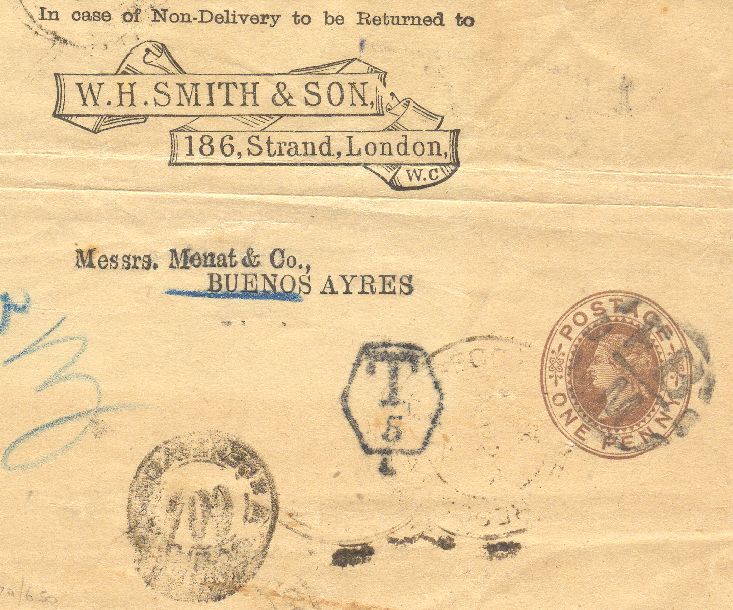 The type below is also commonly seen on W. H. Smith & Son wrappers, this one dated 25 Nov 1899. A precancel?